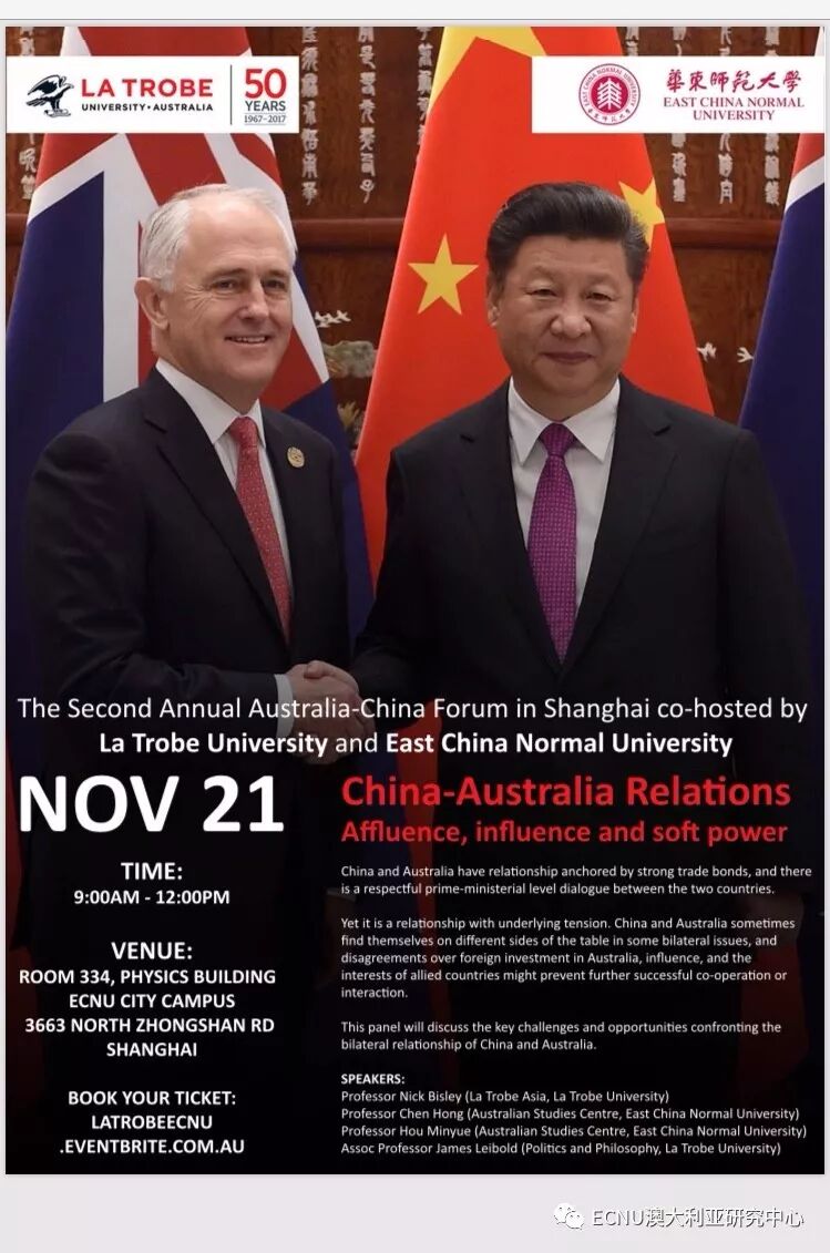 由华东师范大学澳大利亚研究中心与澳大利亚乐卓博大学亚洲研究院(La Trobe Asia)联合举办,第二届“中澳年度论坛”(The Second Annual China Australia Forum)将于华东师范大学澳大利亚研究中心举行。